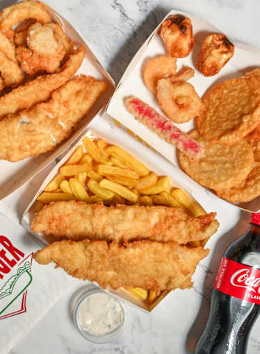 3 flakes, 6 calamari, 4 Scallops or prawns, chips, 6 potato cakes, & 1.25L drink